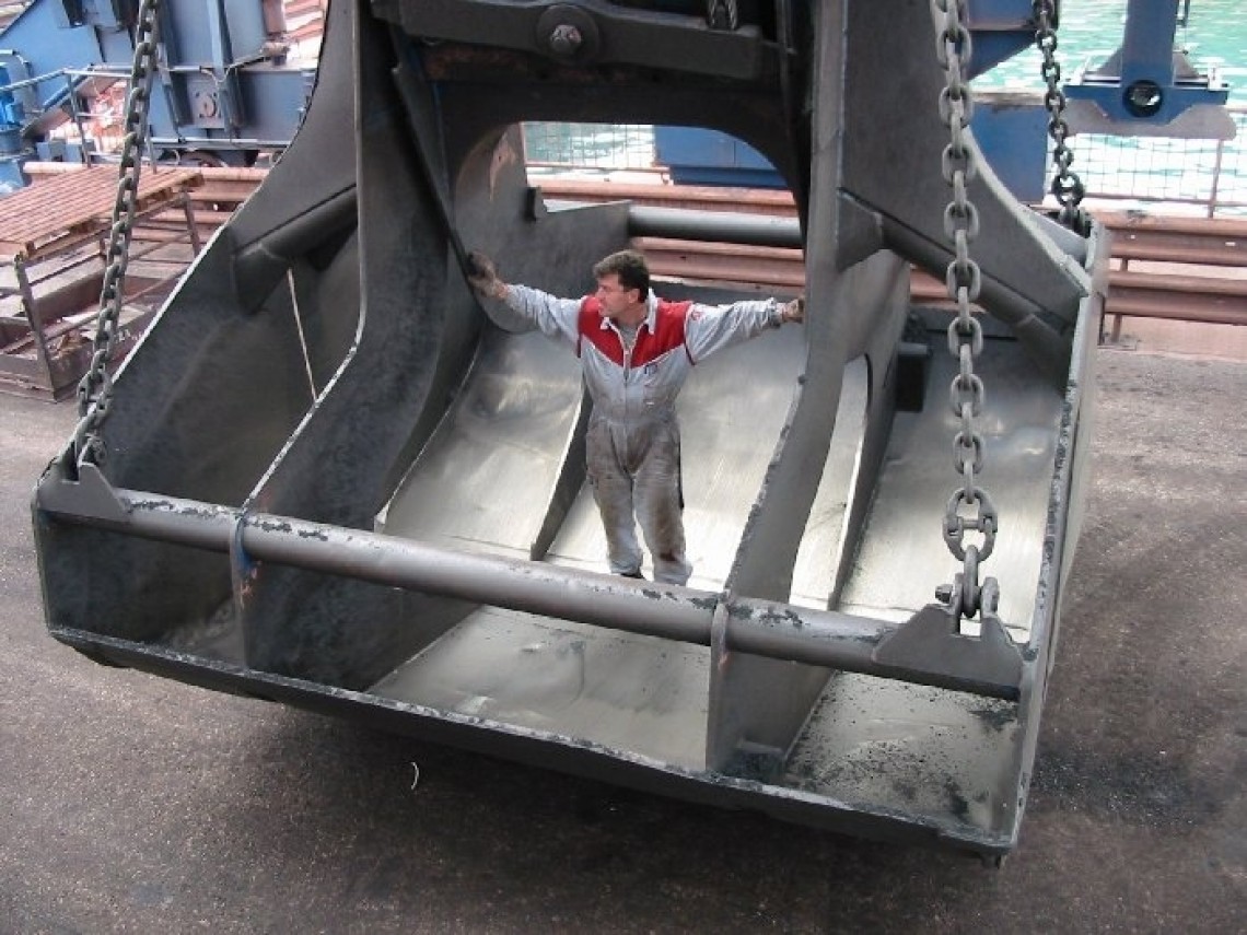 Bridge crane with big grabs, grabs bulk materila in the ship and transports it back in his bunker on the coast. At one time machine can grab up to 40 tons of cargo.